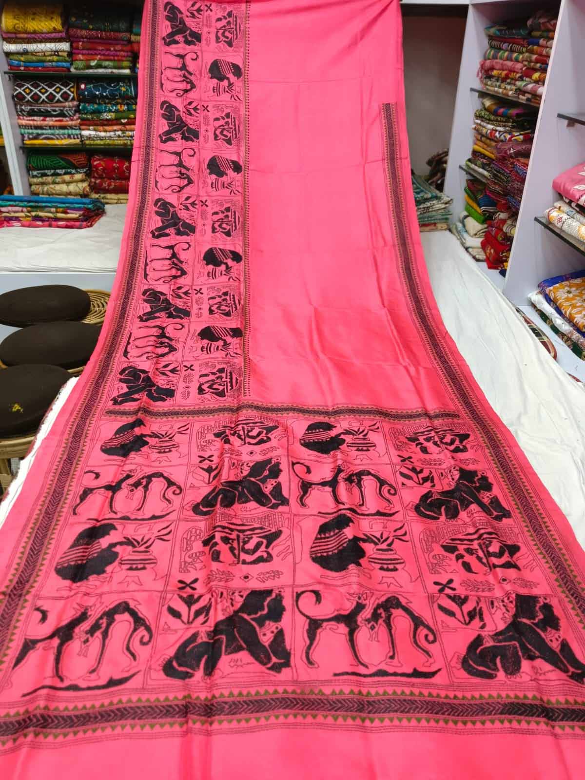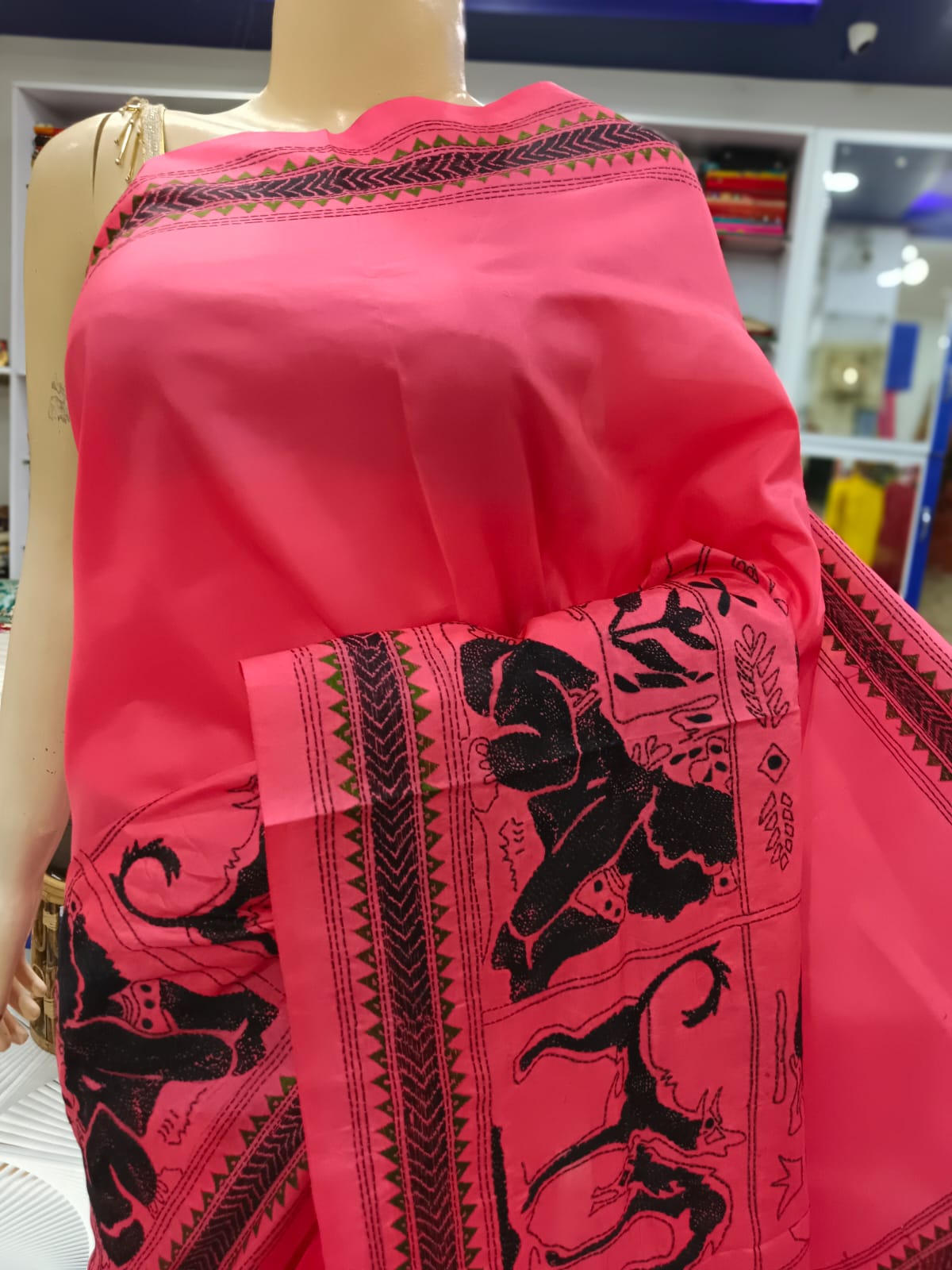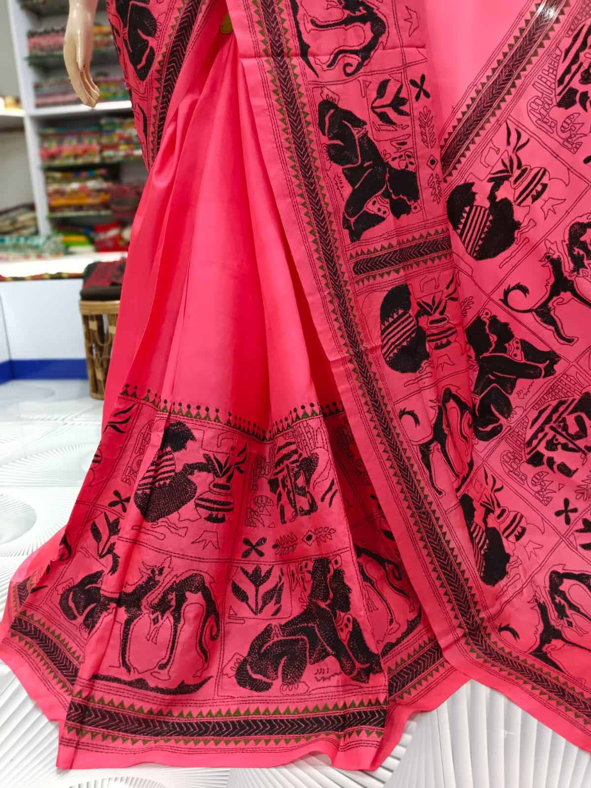 Whether worn for a grand celebration, a traditional ceremony, or an intimate gathering, the “Hot-pink coloured Pure Bangalore Silk Saree with black coloured thread work” is sure to make a statement. Embrace the timeless elegance of this exquisite kantha stitch silk saree and let its beauty illuminate your presence with grace and charm.