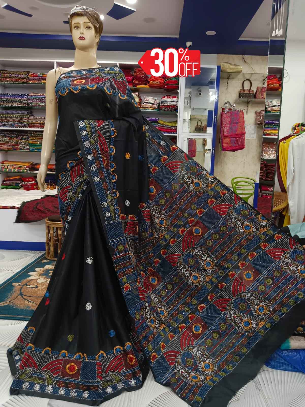 2. Intricate Kantha Stitch: Each saree features meticulously handcrafted Kantha embroidery, showcasing intricate motifs and patterns that reflect the rich cultural heritage of India.