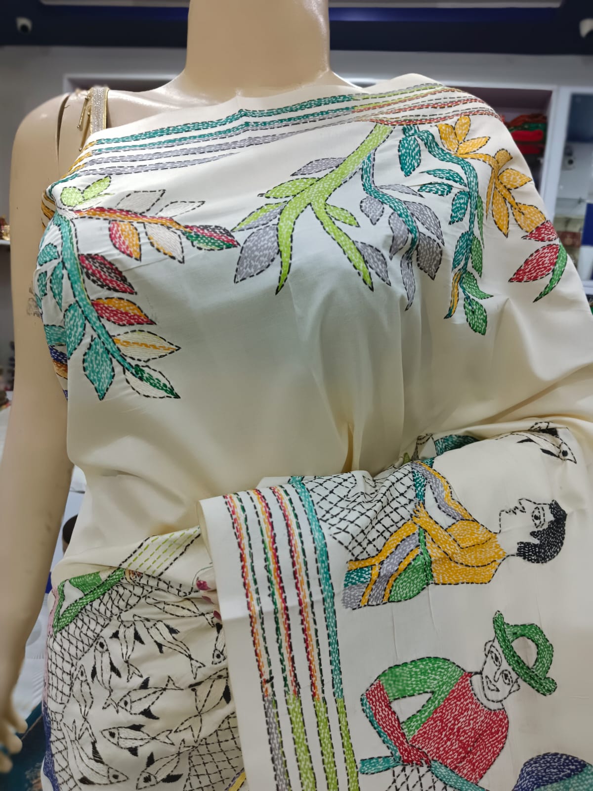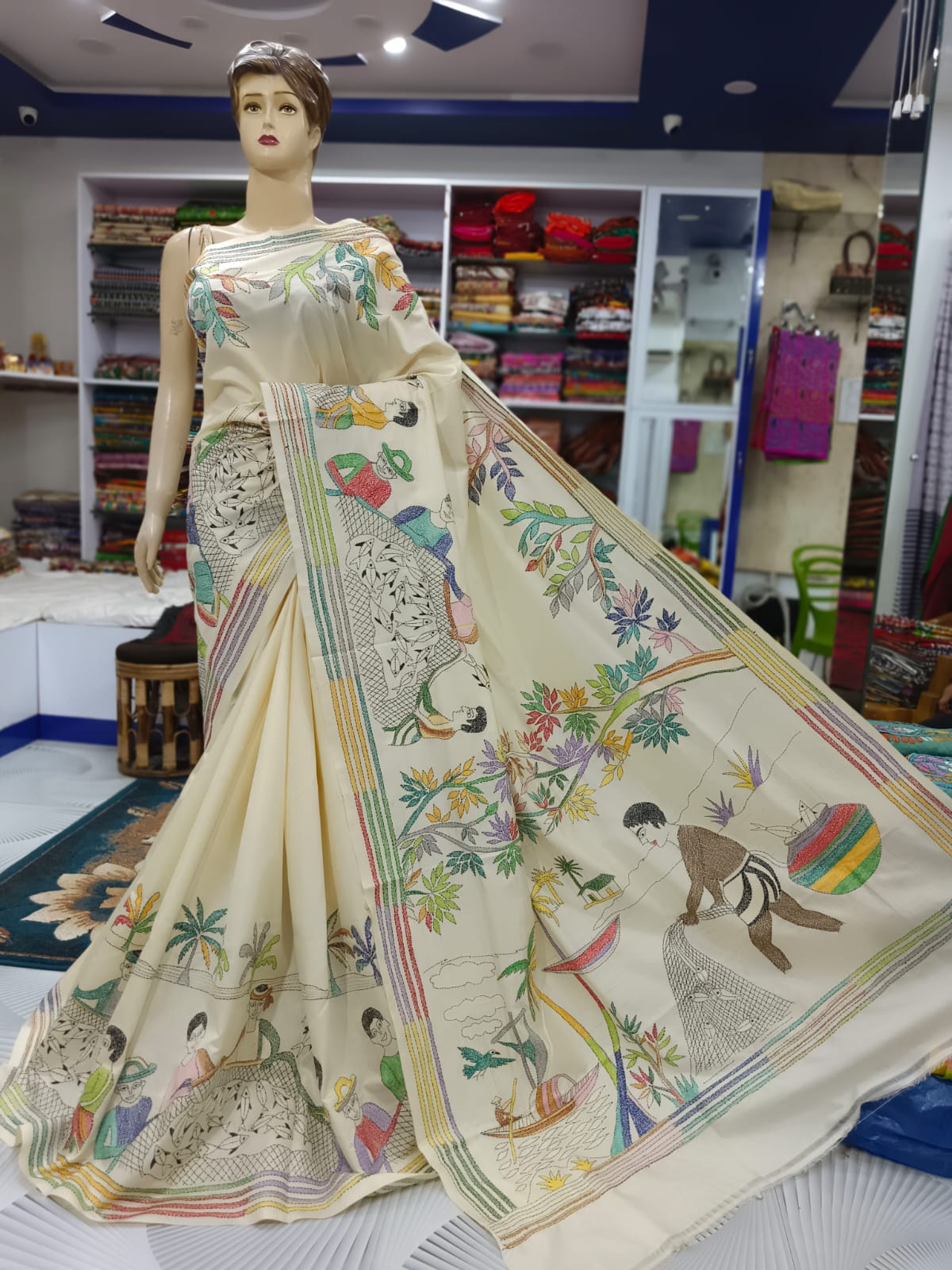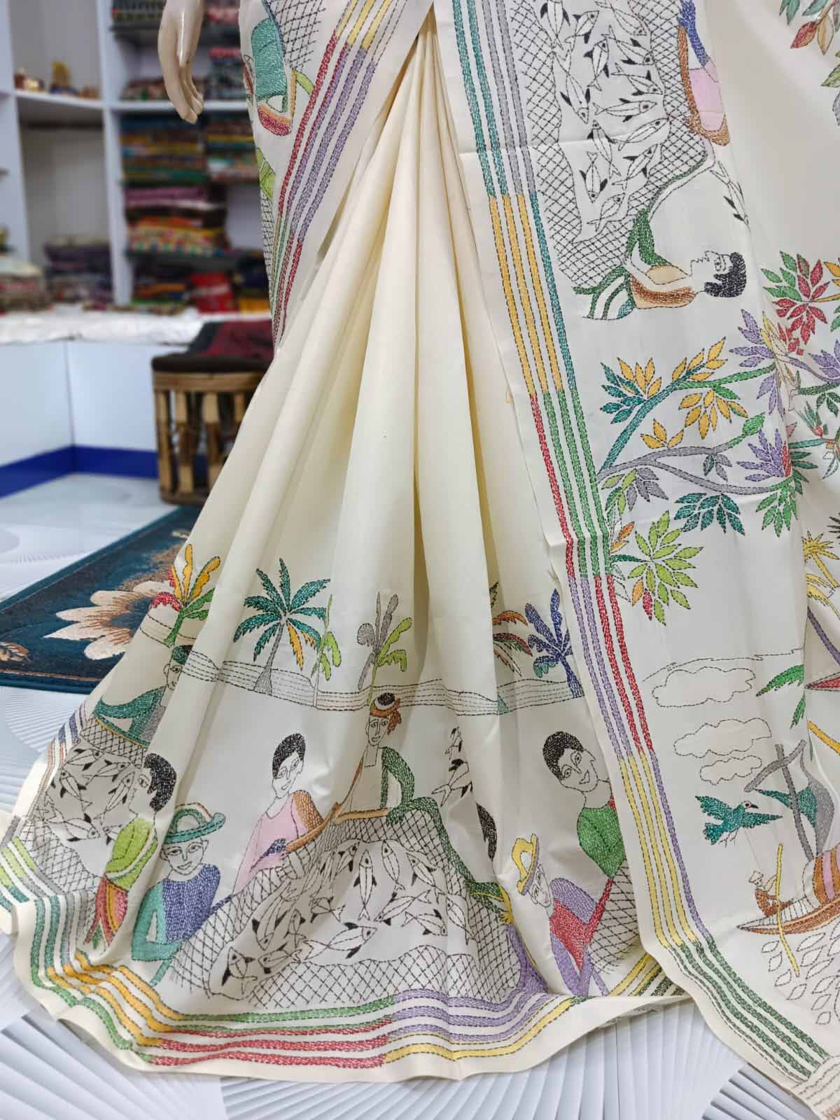 Design and Kantha Stitch: The highlight of this saree lies in its intricate multicolor Kantha stitch, delicately handcrafted by skilled artisans. Each stitch tells a story, forming vibrant patterns that adorn the fabric with timeless elegance and charm. The array of colors adds depth and dimension to the saree, making it a true work of art.