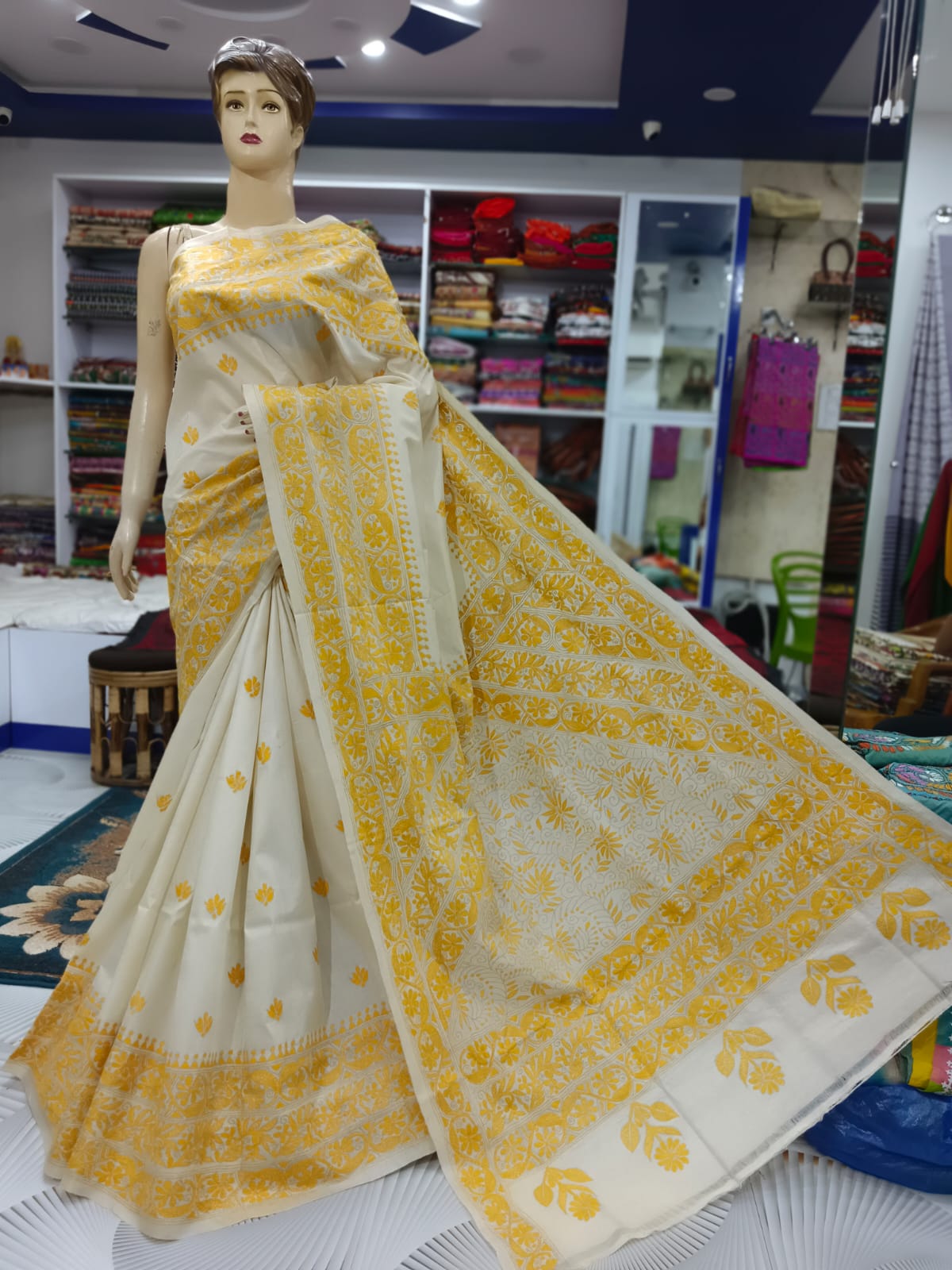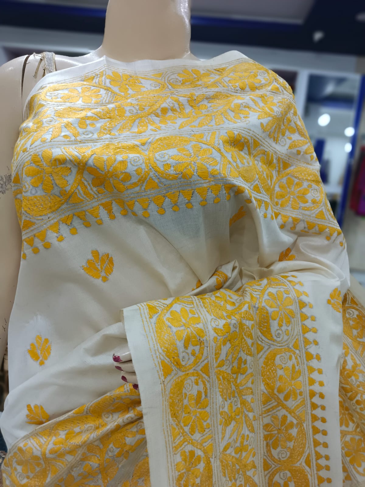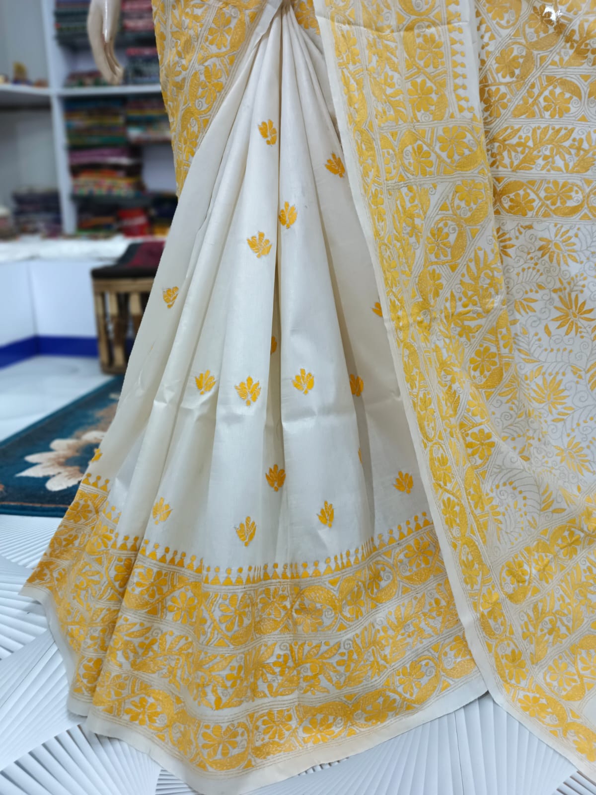 Craftsmanship and Fabric: Indulge in luxury with the finest Pure kantha stitch tussar  silk saree, renowned for its rich texture and graceful drape. Each saree is meticulously woven to perfection, ensuring a luxurious wearing experience that exudes sophistication.