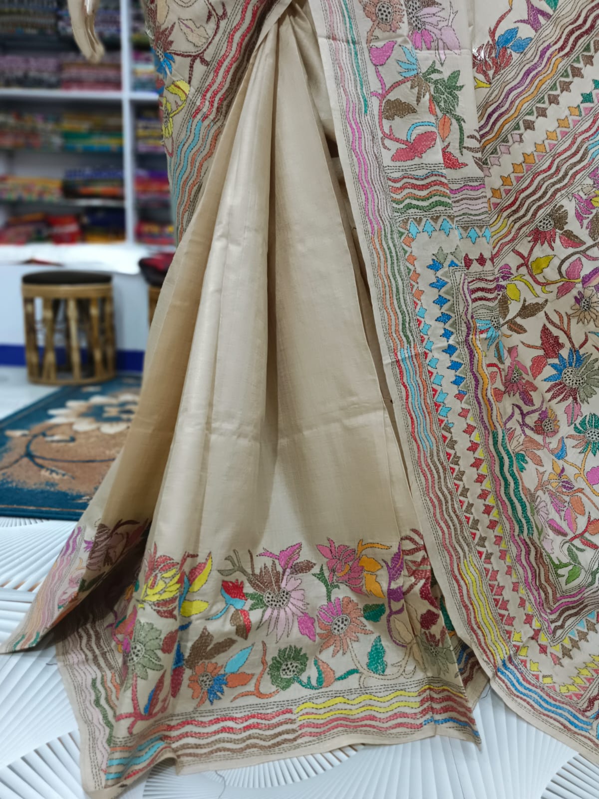 Cream coloured pure gachi tussar silk saree with multi coloured kantha worked. One mtr blouze pc included with the saree.