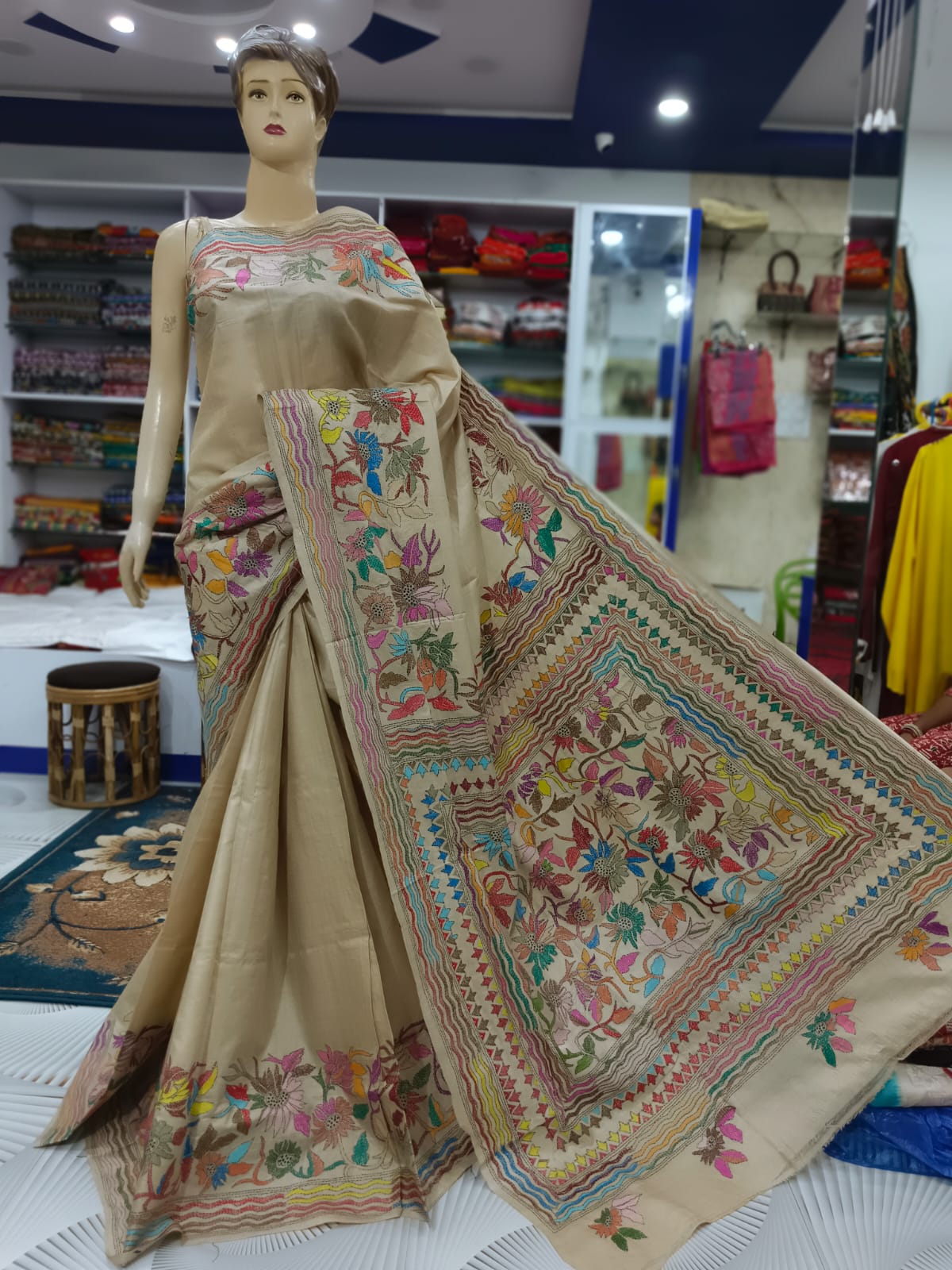 Craftsmanship and Fabric: Indulge in luxury with the finest Pure kantha stitch tussar silk saree, renowned for its rich texture and graceful drape. Each saree is meticulously woven to perfection, ensuring a luxurious wearing experience that exudes sophistication.
